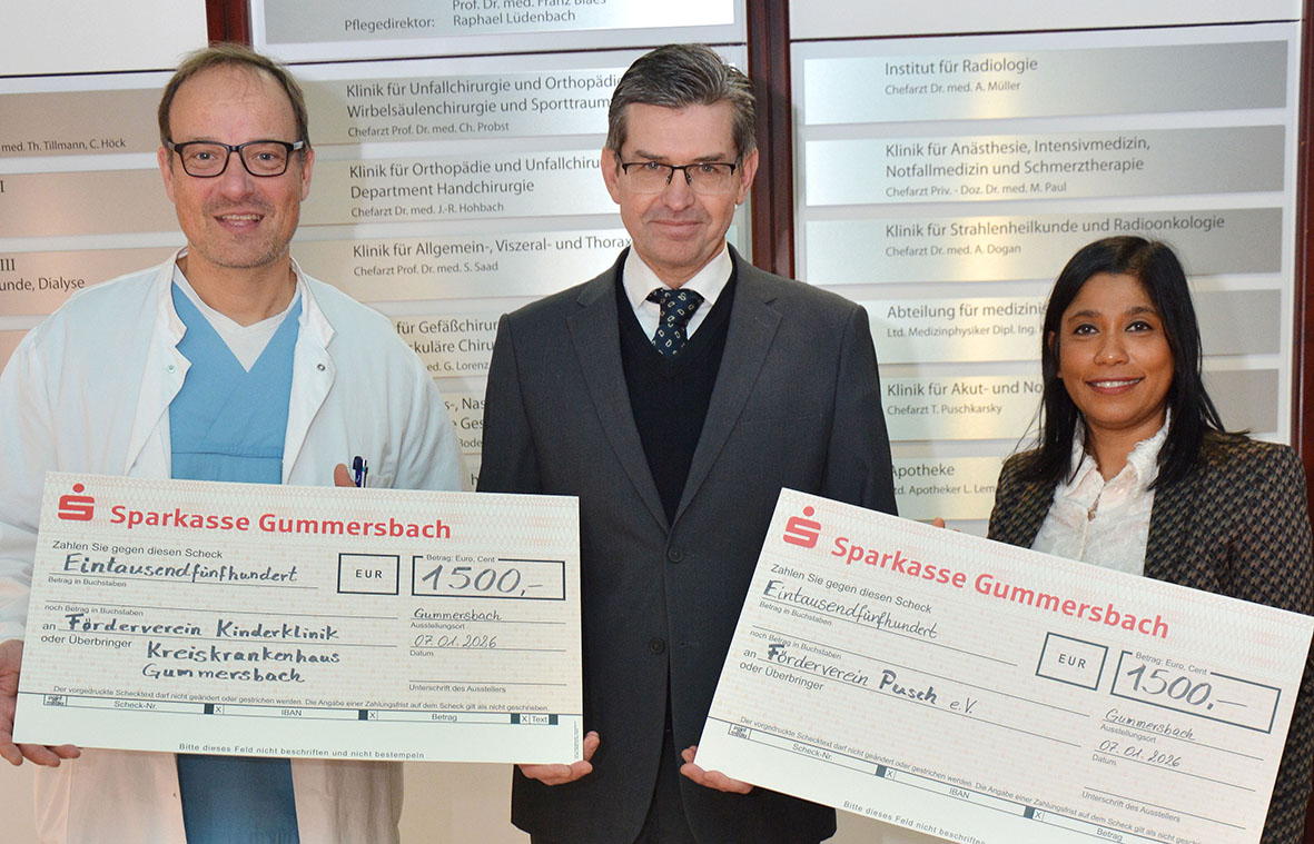 Geschäftsführer Magnus Kriesten überreichte die symbolischen Spendenschecks über jeweils 1.500 Euro an Chefärztin Thayalini Boll (Klinik für Kinder- und Jugendpsychiatrie) und Chefarzt Dr. Roland Adelmann (Klinik für Kinder- und Jugendmedizin).