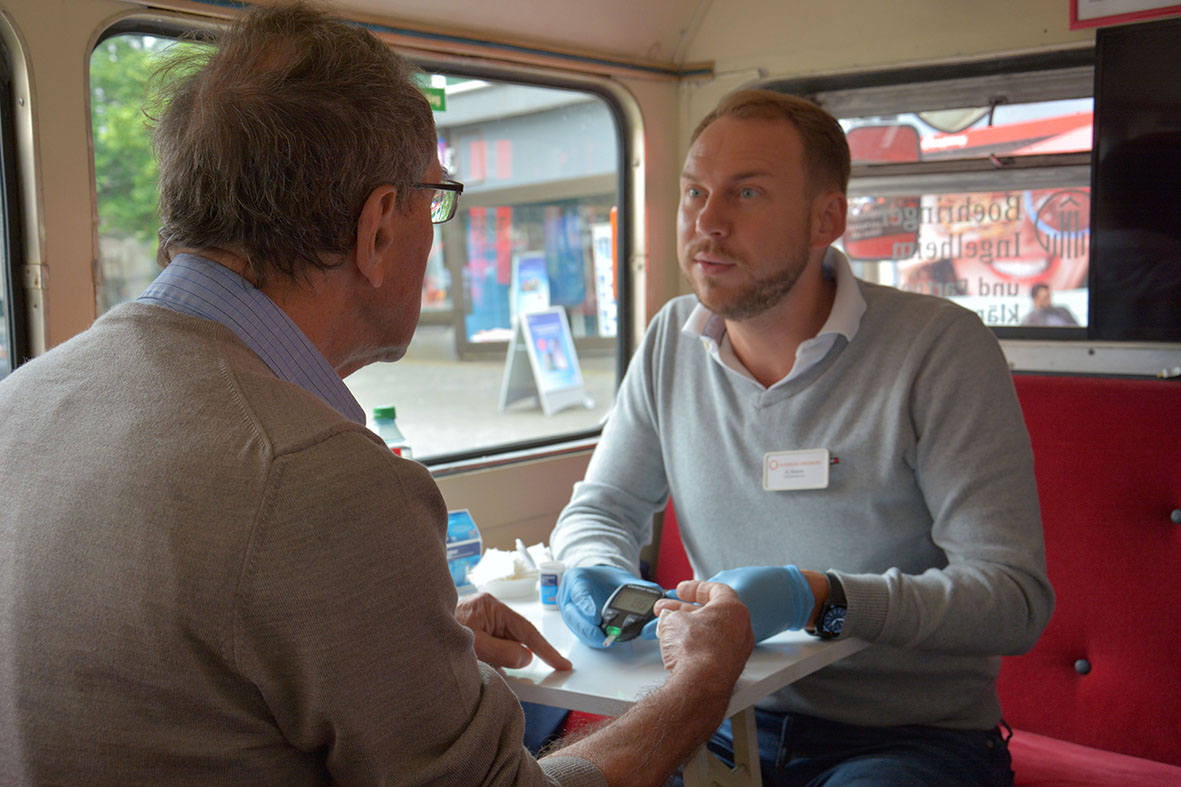 Wie entsteht ein Schlaganfall? Gehöre ich zur Risikogruppe? Welche Vorsorgemaßnahmen kann ich treffen? Was muss ich beachten, wenn ich Diabetiker bin oder an einer Herz-Kreislauf-Erkrankung leide? Wo bekomme ich Hilfe, wenn ein Angehöriger nach einem Schlaganfall pflegebedürftig ist? Antworten gab es am Montag, 3. Juni, in einem roten Londoner Doppeldeckerbus, der auf seiner deutschlandweiten Tour auch in Gummersbach Station machte. Der Info-Bus und zwei Rettungswagen standen von 10 bis 15 Uhr auf dem Lindenplatz in der Fußgängerzone. Die Schlaganfall-Initiative Oberberg sorgte für ein umfangreiches Aufklärungsprogramm: Ärzte und Therapeuten des Kreiskrankenhauses Gummersbach, der Dr. Becker Rhein-Sieg-Klinik, der MediClin Klinik Reichshof sowie Mitarbeiter des Rettungsdienstes des Oberbergischen Kreises und der AOK Rheinland/ Hamburg boten verschiedene Gesundheitschecks und Ernährungsberatung an. Zudem standen alle Experten für Fragen von der Prävention über das Verhalten im Notfall bis zur Pflege zur Verfügung.