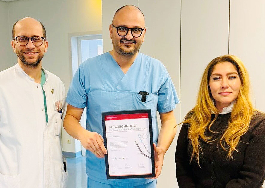 Ghasal Saeidi, Territory Sales Managerin von Johnson & Johnson MedTech, überreichte heute die Urkunde an den Chefarzt der Klinik für Kardiologie, Prof. Dr. Vedat Tiyerili, und den Leitenden Oberarzt Dr. Naseer Al-Khrasha. „Die Auszeichnung als Impella®-Zentrum bestätigt die hohe Qualität unserer kardiologischen Versorgung und die enge interdisziplinäre Zusammenarbeit unseres Teams“, betont Prof. Tiyerili. „Für unsere Patientinnen und Patienten bedeutet dies, dass wir modernste Medizintechnik auf internationalem Niveau wohnortnah anbieten können.“ Auch Dr. Naseer Al-Khrasha hebt die Bedeutung der Anerkennung hervor: „Der sichere Einsatz der Impella®-Herzpumpe erfordert Erfahrung, strukturierte Prozesse und ein spezialisiertes Team. Die Auszeichnung unterstreicht unsere kontinuierliche Weiterentwicklung in der interventionellen Kardiologie.“